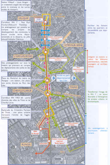 A cette occasion, la RN7 sera requalifiée au sud de Villejuif et la ligne de tramway s'inscrira dans les objectifs du Plan de Déplacement Urbain de la Région Ile-de-France., visant à favoriser l'usage des transports collectifs.