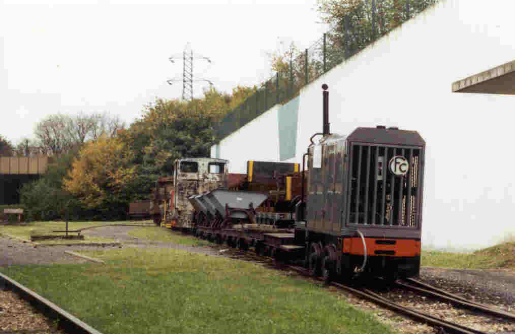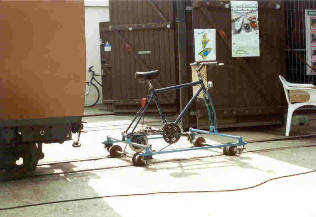 | La rame de wagonnets, 2 plats, 2 fourches pivotantes et 4 bennes Decauville de 1925 assuré par le 0B0-11 O&K | et le vélo rail de Denis. |