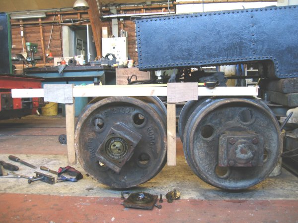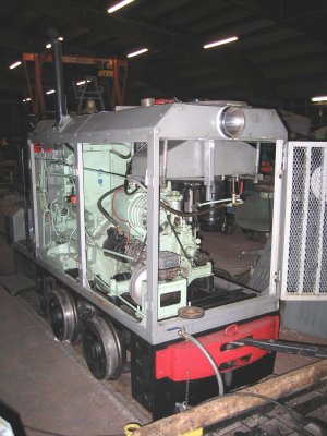 Après avoir essayé d'adapter un beau moteur de bateau à cet engin, Jean-Pierre a dû renoncer à cette solution en raison des difficultés d'adaptation sur l'embrayage. Malheureusement, vu le très mauvais état du moteur d'origine, qui est par ailleurs incomplet, la remise en état de celui-ci avec les seules pièces à disposition relève du miracle. Certes, ce type de locotracteur est relativement rare en France, mais sait-on jamais ? Si certains ont remplacé le moteur d'origine par un moteur plus récent en état de marche pour des raisons de simplicité, peut-être reste-t-il quelques pièces dans un coin ? Nous serons ravi d'en discuter avec vous lors des 20 ans de notre association en Juin 2004 (Cf. LVDC n° 77). Par ailleurs, l'essieu avant qui avait sans doute déjà subi une réparation de fortune, ce locotracteur n'étant autrefois qu'en présentation cela suffisait sans doute, s'est cassé lors d'un déplacement. Il va donc falloir le ressouder voire le remplacer, soit par un axe de récupération après usinage, soit par un axe neuf. Là encore, en tant que bénévoles, toutes les suggestions nous intéressent...