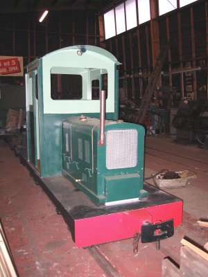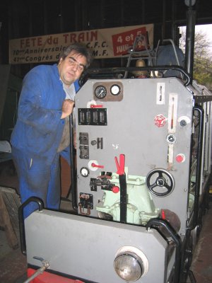 Souvenez-vous en 2001, ce locotracteur de conception artisanale soignée était d'une pâle couleur bleue avec des bandes jaunes sur le châssis. N'a-t-il pas fière allure aujourd'hui dans cette belle livrée de vert clair et foncé ? Admirez le sol de la cabine réalisé en plancher vernis du plus bel effet ; plancher de récupération cela va de soi au CFC ! Bravo Freddy pour cette superbe restauration. Il ne te reste plus qu'à confectionner un fauteuil de velours bordeaux capitonné...