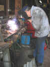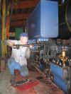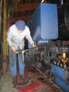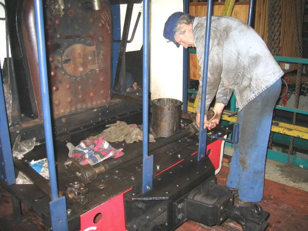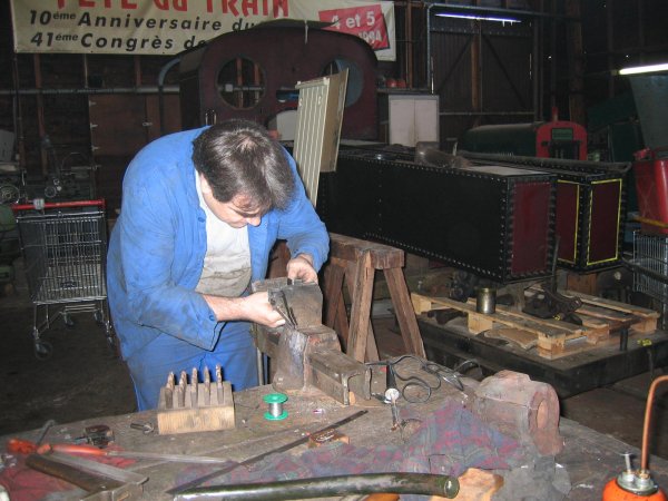 Une fois la première couche de peinture sur les parties décapées du châssis de mon Jung, me voilà embauché par François pour le démontage des boulons récalcitrants de la deuxième soute à charbon de sa machine. Il y en a un qui est au fond ; il faudrait l'empêcher de tourner... Oui, mais voilà : son état de rouille avancé ne permet pas à la clé de garder prise. Qu'à cela ne tienne, fichu pour fichu, je tronçonne ; allongé sur la soute, et la tête dedans ! Le CFC, nouveau club de gim. branché ; vous ne connaissez pas ? Quel dommage, justement à ce propos...