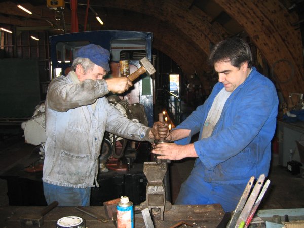 Ayant fait la veille, avec Marc-André, un rapide diagnostique des jeux des embiellages de la Bouillotte, il démonte les bielles, avec les coulisses de relevage, en vue de la fabrication à neuf des axes des coulisses. Ceux ci comportant une rainure en arc de cercle à chaque bout, ils ne peuvent être fabriqués avec les moyens dont nous disposons. Ces éléments sont confiés à la société Merlin-Castet. Nous en profitons pour soumettre à cette entreprise le