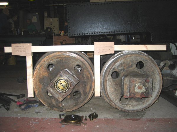 bandage des roues de l'essieux avant de mon Jung 0B0-20. La difficulté pour cela est de trouver ou de réaliser des ébauches car pour deux pièces, il est difficile de réduire les coûts, mais nous n'avons pas dit notre dernier mot... Après un bon déjeuner, Marc-André démonte également l'arbre de relevage afin de modifier les paliers pour simplifier le démontage de celui-ci ; paliers qu'il faut également démonter...
