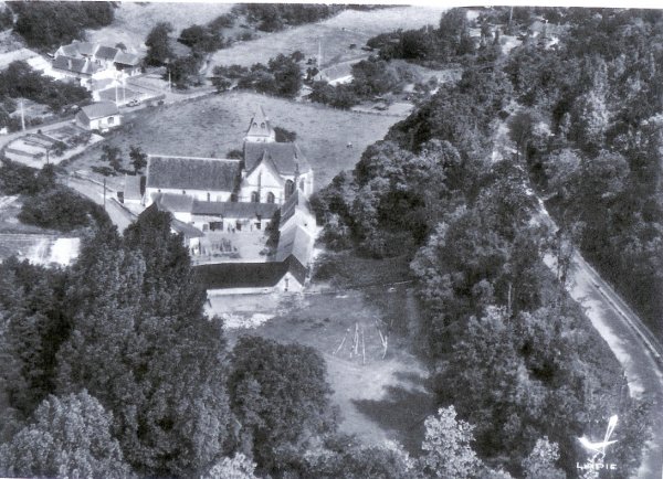 L'église en 1950. Noter la voie en remblai sur la droite de la photo. |