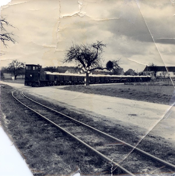 Locotracteur et rame de wagons venant de la carrière de Villeneuve traversant la Route départementale et prenant la direction de Roberval. |