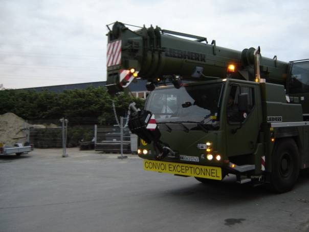 À la tête du bataillon les hommes changent mais le matériel et les méthodes aussi et c’est ainsi que nous avons vu arriver lundi 30 mai à 6h30 du matin en convoi exceptionnel pas moins de deux camions porteurs 3 essieux Renault type G390, une remorque de 24 tonnes de charge utile et une grue routière 3 essieux de marque Liebherr accompagnés, ou devrais-je dire, précédés par une fourgonnette d’accompagnement.