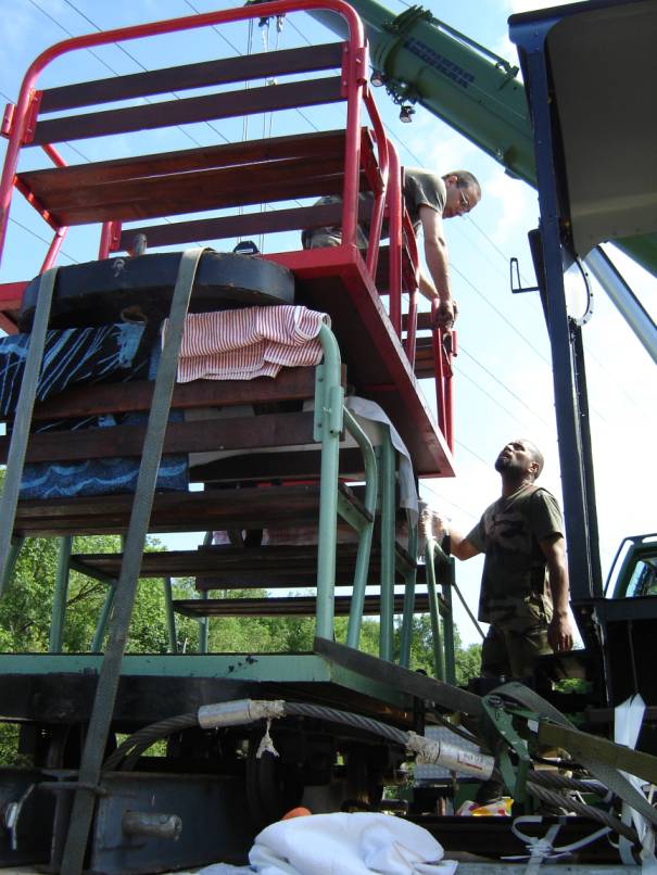 Equipés de crics et de cales nous avons soulevé la 030 afin de passer les poutres en dessous, bénéficiant d’une meilleure assise. Nous avons dans l’urgence réalisé des barres anti-rapprochement afin de maintenir les poutres aux extrémités du châssis. Le levage fut aussi spectaculaire puisque le seuil de chargement du camion était plus élevé. Nous étions déjà plus en confiance, le premier essai fut le bon.