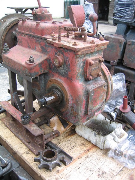 Jeudi 19 Août : Montage des boisseaux gauche puis décapage des plaques de garde. Peinture de ces dernières et retouches de peinture sur le châssis. L'après-midi fut consacrée à la vidange de la boîte de vitesses. Après ouverture de la trappe de visite arrière du bloc "boîte de vitesses-inverseur", je découvre les pignons coniques de l'inverseur dans un état plus que satisfaisant, pour ne pas dire exceptionnel ! Une fois le bouchon de vidange enlevé... rien ne coule et pourtant, ça baigne dans l'huile ! Le problème est vite résolu avec un bout de fil de fer ramoneur. Hummm, la bonne sauce !... Il faut boire la soupe tant qu'elle est chaude disait ma grand-mère... à juste titre, mais de celle là, très peu pour moi. Néanmoins, pendant qu'elle s'écoule, j'en profite pour décaper et peindre la plaque de visite à l'antirouille.