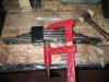 déformés par la rouille puis lors du démontage au chalumeau, je décide de les remplacer. Par chance, je trouve deux boulons qui, après légère modification (filetage et longueur), font tout à fait l'affaire. Je démonte ensuite la tringle de blocage du levier de frein ainsi que divers petites pièces du levier,