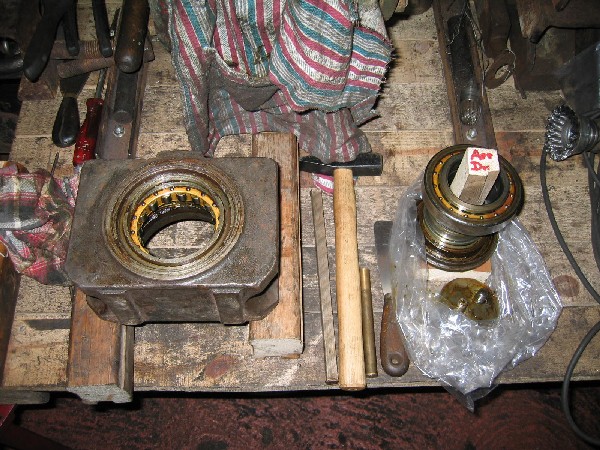 Une boîte d’essieu et les roulements d’une autre sur sa chandelle (25/08/04). |