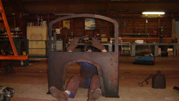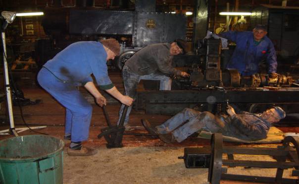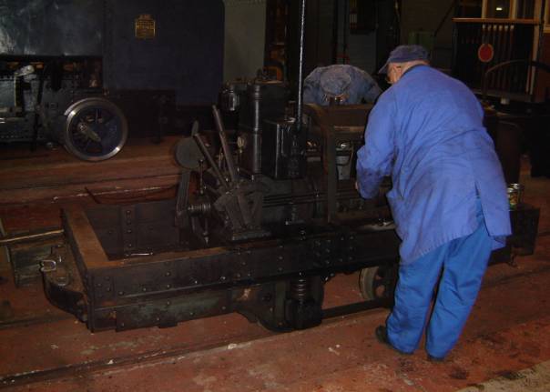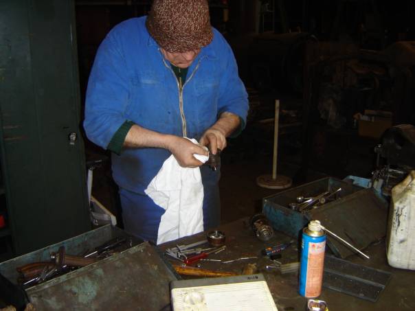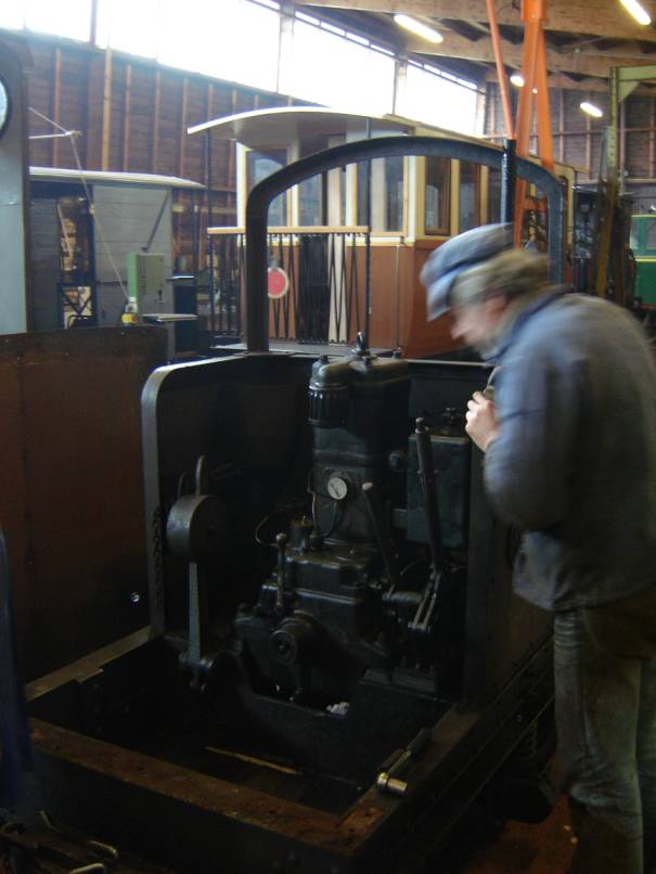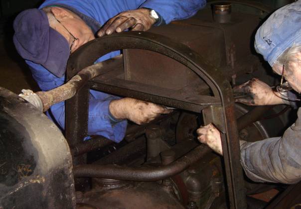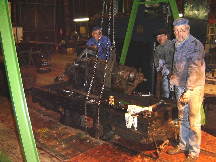 Le professionnalisme reprenant ses droits, chacun trouvait son rythme et le démontage se poursuivit jusqu’à la dépose de la boîte de vitesse, nécessaire étape avant la mise à bas du moteur. Nous avons pu admirer le parfait état de conservation du châssis alors que Jean-Louis, historien du CFC nous indiquait, preuves à l’appui la teinte dont il souhaitait couvrir l’engin. Nos sympathiques membres nous quittèrent un à un, je restais avec Jean-Baptiste pour la mise au point de la draisine à bras, ayant apporté une modification au plateau d’entraînement. Un essai tardif (20h00) confirma le bien-fondé de la transformation, nous pouvions enfin à notre tour rentrer.