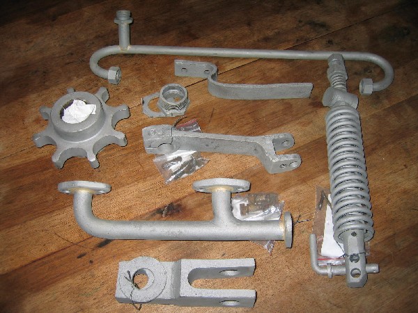 Les pièces et ensembles décapés : à droite le tirant d’embrayage remonté. (16/04/05) |