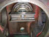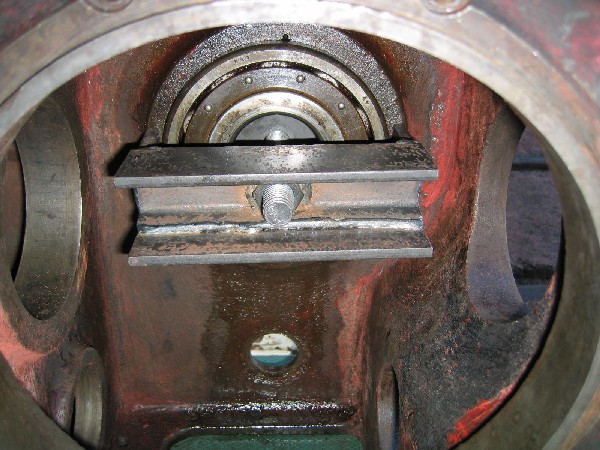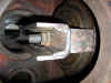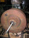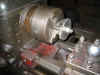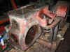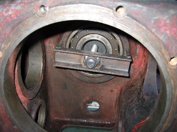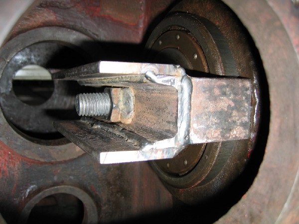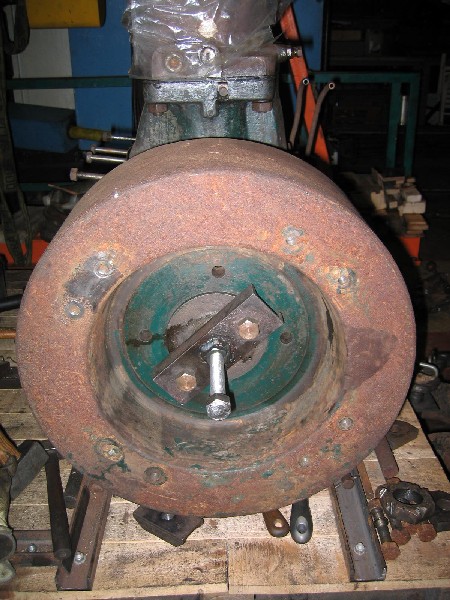 Les ''opérations'' commencent donc par le démontage du bloc ''couvercle fourches'' de la boîte de vitesse. Je fabrique ensuite un arrache moyeu spécial, pouvant être inséré au centre de la cloche du volant d'inertie puis procède au démontage de celle-ci, ainsi que des vis et de la plaquette frein de l'écrou bloquant le volant d'inertie. Cet écrou de taille imposante, mais à la norme américaine, et ayant de ce fait souffert d'un précédent démontage au burin, a un bel aspect de fleur des champs !... D'après la documentation dont je dispose sur les Jung type ZL 105 et EL 110 (voir