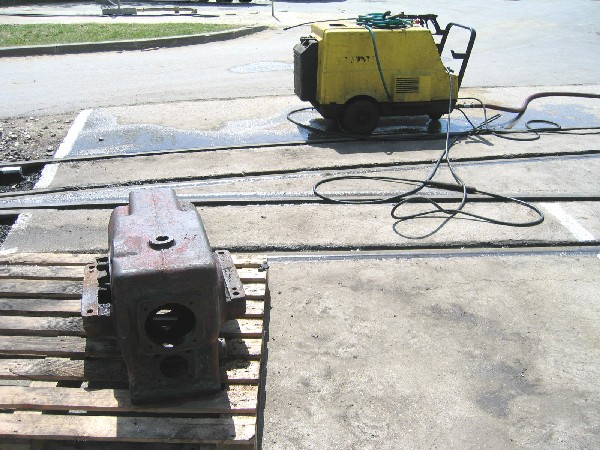 Jeudi 26 Mai : Ca y est ! Après bien des efforts l'axe et la pédale d'embrayage sont enfin démontés ! J'ai fini au pied de biche ; oui, tout de même ! L'opération suivante est bien plus facile : nettoyage au karcher ; le carter confortablement installé dehors sur une palette hors d'usage (merci à nos aimables voisin M.O. RADIA de la Z.I.). Avec le CFC, recyclage assuré ! Et vive le soleil !