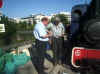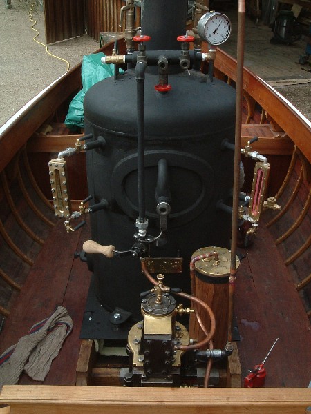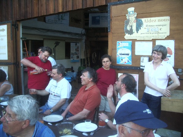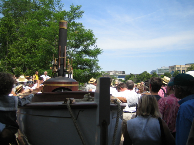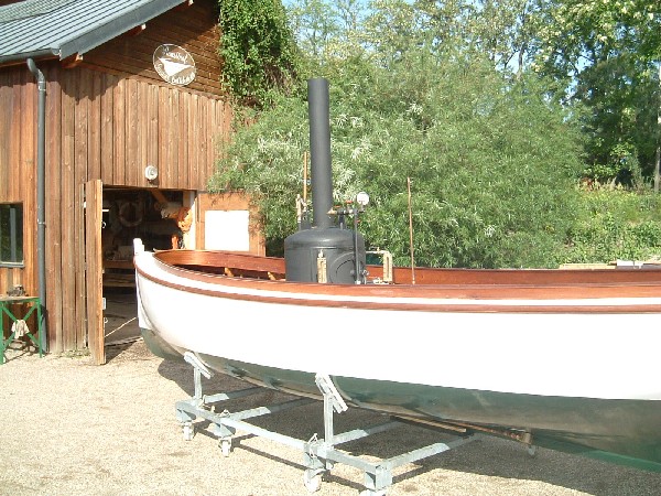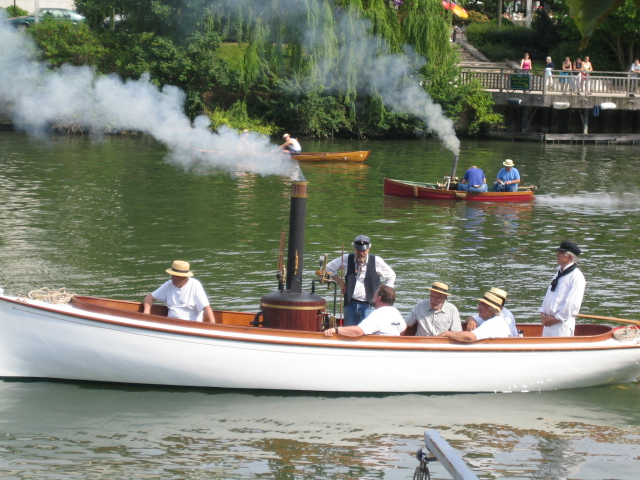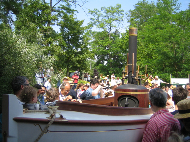 A 15 heures la chaloupe touchait pour la première fois l'eau séquanaise sous les applaudissements du public. Puis elle fut amarrée au ponton pour le remplissage de la chaudière. Tout était prêt pour l'allumage, sauf le briquet. Heureusement François B. était là et, pour la petite histoire, c'est le briquet de la Bertha qui a allumé la chaudière de Suzanne.