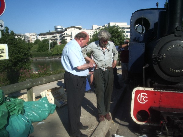 En fin d'après-midi la Bouillote était en chauffe et le train inaugural de cette nouvelle ligne a été consacré aux officiels, avec juste derrière la locomotive Monsieur Christian Murez, maire de Châtou qui nous a prodigué un accueil chaleureux. Il était fier de voir un train à vapeur évoluer dans l'île des Impressionnistes.
