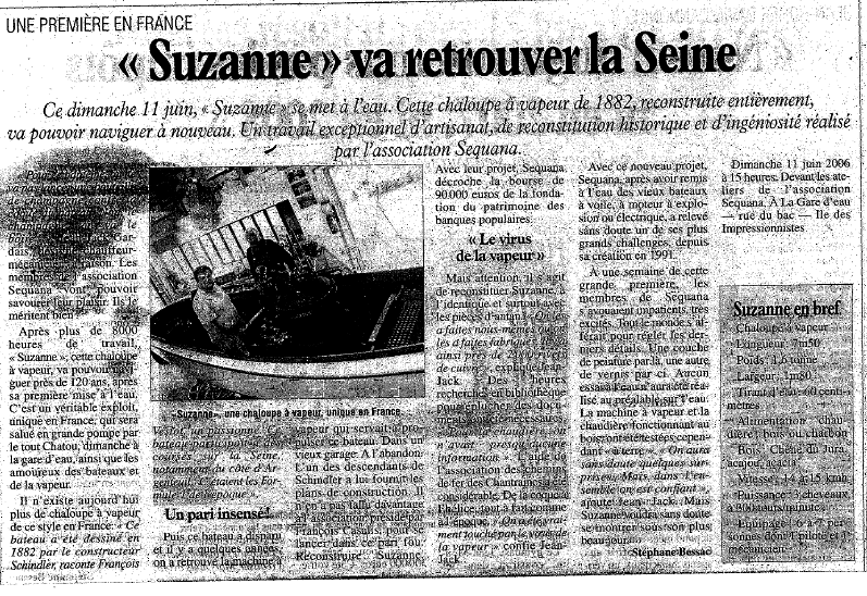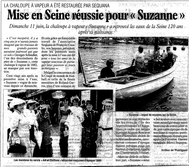 Pendant la mise en chauffe, Suzanne fut tractée sur le fleuve puis une heure plus tard livrée à sa propre propulsion, évoluant souplement au rythme feutré de son moteur plus que centenaire. Après une petite heure, nous accostions au ponton pour faire le plein de bois et Monsieur Schindler prenait place à bord pour une nouvelle évolution. Nous avons tous senti que pour lui ce petit voyage était chargé d'émotion. En fin d'après-midi, nous regagnions, par nos propres moyens, le centre nautique de Rueil où la grue nous attendait pour la sortie de l'eau. La durée d'exploitation a été de deux heures, plus que l'objectif que nous nous étions fixé.