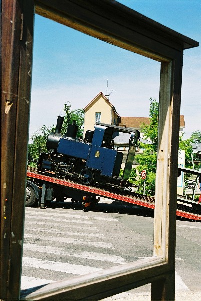 Le vendredi 9 juin à 13 h 30 le camion de l'entreprise Berto arrive au CFC pour charger la machine et deux baladeuses de petits gabarits. Une heure plus tard il arrive sur l'Île des Impressionnistes et la locomotives est déchargée devant la Maison Fournaise. Quelques éléments de voie ont été posés sur la chaussée. Le trajet commencera par une courbe à 90 degrés.