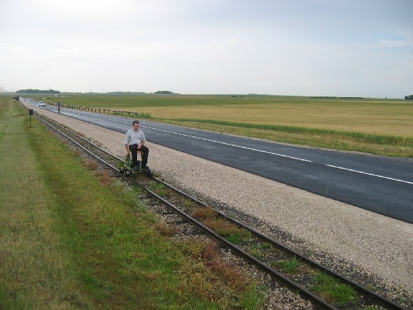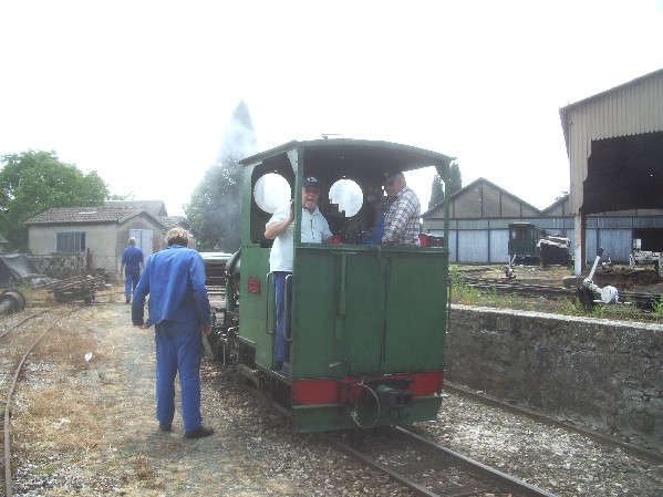 Le vendredi 16, nous commencions les essais en ligne, DLG et Alain Dubourdieu sur la Tabamar, moi et Bernard Merger sur la Bouillote avec un plat Péchot et une baladeuse type Royan. Nous vérifiions le passage des machines sur l'ensemble des appareils de voie et taquets d'arrêt. Nos pilotes attiraient notre attention sur les points singuliers de la ligne. Tout d'abord, la retenue du train dans la descente qui longe le dépôt et l'arrêt au PN, puis le croisement VN-V60 de l'embranchement particulier et les différents ralentissements en ligne.