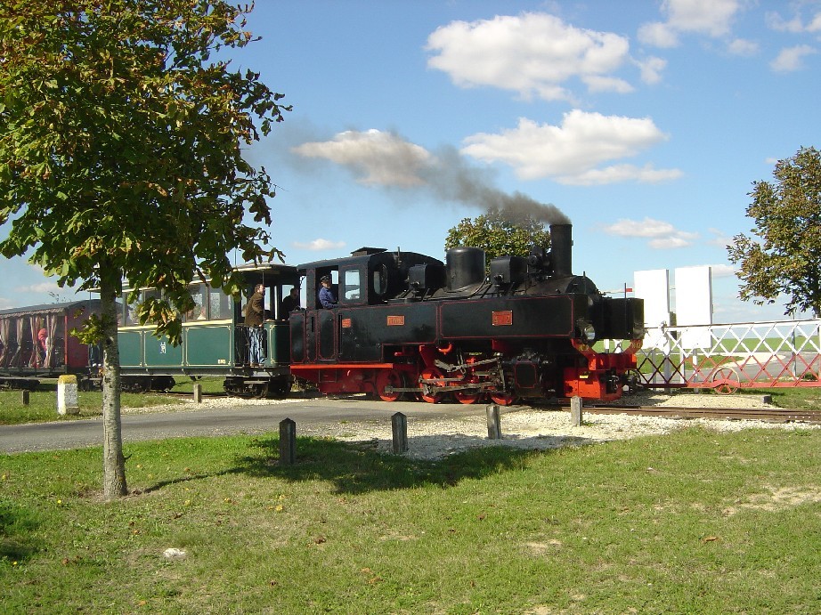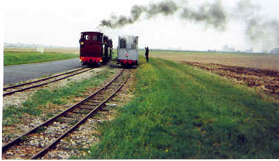 des «noyaux de pêches». Une courbe, anciennement dotée d’un dévers suit, à ne pas prendre trop vite, surtout si l’on tire les «Valenciennes», assez hautes sur pattes, et qui ont tendance à jouer les danseuses de premier ordre !!! Le voyage continue, toujours en accotement, comme cela était dans le temps du réseau betteravier du TPT. Les banquettes ont été aménagées, avec rectification de la voirie, ce qui est un plus au niveau de la sécurité ; au moins le train touristique n’est plus hors la loi, alors qu’il avait roulé ainsi pendant plus de cent ans au bord de la RD22, avant les titillements administratifs récents de la DDE, pourtant exploitante du réseau jusqu’en 1964. Le petit train était alors devenu dangereux.