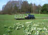 Le matin, inspection de la voie avant la reprise de l'exploitation. Le train photographié au milieu des jonquilles. |