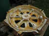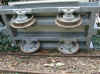 Mon loco est composé d’un châssis en U de 100 reposant par l’intermédiaire de 4 ressorts à boudins sur un truck souple en U de 80 permettant aux quatre roues de rester toujours en contact avec la voie. Les longerons sont réunis par les essieux fixes en carré de 40 mm. Les roues très larges sont folles et montées sur des bagues en bronze avec graisseurs. Le moteur de deuche est à l’avant et je suis assis à l’arrière avec le réservoir, et la batterie sur l’essieu arrière, seul moteur.