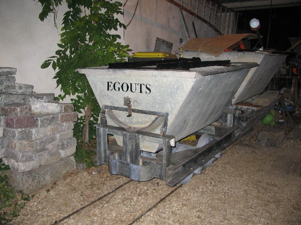 Quelques plats, un tombereau très utilisé pour les travaux du jardin, une benne d’origine TP basculant d’avant en arrière pour les galeries très étroites, un fourgon maison (cabane à roulette de mon petit fils).