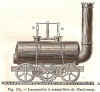 La locomotive de Stephenson et Dodd. Les roues sont couplées par une bielle d'accouplement. Les essieux sont calés à 90° pour que la progression du véhicule soit continue. |