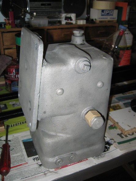 Filtre et réservoir à huile : Décapage et peinture antirouille verte du carter de filtre, de son couvercle et de sa boulonnerie. Relevé du marquage de fonderie : MM 3741. Décapage et peinture du cerclage de niveau de réservoir d'huile, découpe de deux joint neufs en Nitrile fin et de deux vitres en plexi.