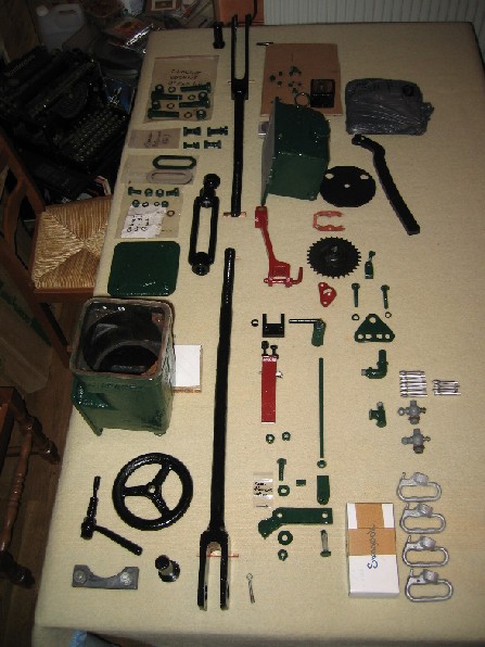 Décapage et peinture des différentes pièces (en noir, en rouge ou en vert selon leur fonction) : boulons divers, plaquette d'arrêt d'écrou de volant d'inertie, diverses pièces du système d'accélération et de régulation, axe à excentrique et entretoises de ventilateur, verrou de pédale d'embrayage.