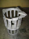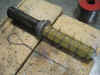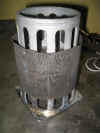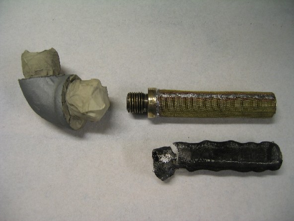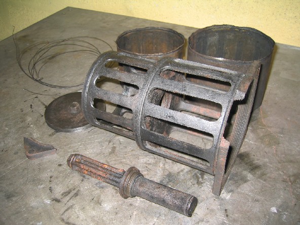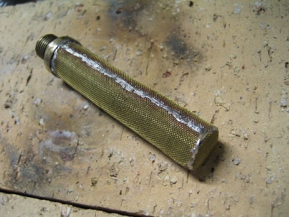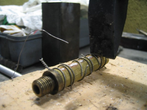 Réalisation de nouveaux manchons en grillage fin pour remplacer ceux trop abîmés. Cette opération délicate consiste, dans un premier temps, à rouler un morceau de grillage préalablement coupé selon la hauteur du manchon à fabriquer, puis à le couper en longueur en veillant à conserver environ 5 mm de recouvrement. A partir de là, les choses se corsent ! Il faut maintenir le grillage roulé serré sur la cartouche filtre pour souder le recouvrement. La méthode que j'ai adoptée est la suivante : fabrication de quelques ressorts en fil de fer, positionnement espacé, pointage à la brasure à l'étain, déplacement des fils de maintiens et complément de soudure. Il arrive que le grillage se relève lors du chauffage au fer ; j'ai alors maintenu les deux bords plaqués avec une simple tige de fil de fer pendant le refroidissement (j'ai même soufflé dessus pour accélérer et soulager mes doigts). Pour terminer, je ligature le haut et le bas du manchon sur la cartouche avec du fil de fer de 0,5 mm. Et voilà comme neuf ! Il ne restera plus qu'à remplir de gros copeaux de bois, eux aussi tout neuf.