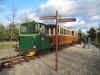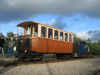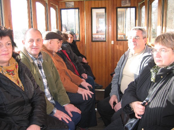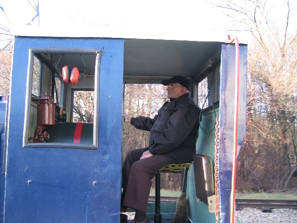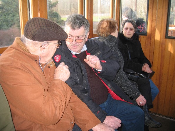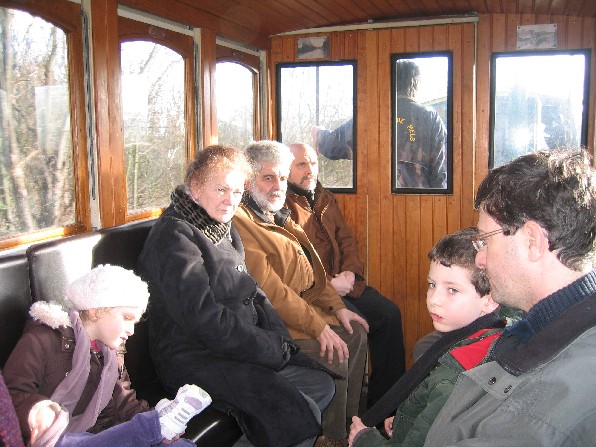 Bref une fois le train constitué et sorti, je laisse tourner un peu le moteur du loco histoire de raviver un peu sa batterie et de lui dégourdir les pistons, pendant ce temps, je prépare l'allumage du poêle à bois avec du papier et des petit morceaux de bois que je trouve dans le bac réservé à cet effet. Mais la réserve de bois, de bonne dimension, étant à mon avis nettement insuffisante, je me mets en chasse afin d'en constituer une. Je vais trouver ça dans le wagonnet d'allumage des vapeurs, pensais-je... Pauvre fut la pêche au fin fond dudit wagon qui se trouve quasi vide ! normal, la saison est finie, mais, malgré tout, en soulevant les cartons, je finis par rassembler suffisamment de morceaux de bon bois (et pas de contreplaqué, d'aggloméré ou de morceau goudronné) pas trop gros afin de pouvoir les couper... encore faut-il que la disqueuse fonctionne, car pas moyen de la faire démarrer... tant pis, ce sera avec la petite scie à ruban, un peu plus long, mais j'arrive tout de même à mes fins. Une fois mon panier rempli, je termine de préparer mon feu ; ne reste plus qu'à l'allumer... bon alors, des allumettes ? N'y pensons même pas, un briquet peut être ? Non, bien sur que non ! Reste le chalumeau ! Et là, la rigolade commence entre le morceau de bois si bien allumé qu'il n'en reste rien ou presque, le second qui s'éteint avant même de sortir du dépôt, le troisième dont il ne reste même plus assez de braises pour allumer le papier semble-t-il un peu humide... Le quatrième essai : un bout de bois entouré de papier ficelé et allumé, bref une torche version 2009, m'apportera la victoire et les premiers crépitements du feu qui démarre... dans une fumée du diable ! Kof, kof, keuf, diantre, mais ce bon vieux poêle à bois est tout percé de rouille !! Je sens que ça va être une galette fumée ! Fort heureusement tout rentre dans l'ordre dès que je ferme la porte du bas, une fois le feu bien pris. Ouf ! Je préfère ça. Un petit coup d'aération et le tour est joué. Maintenant à la deuxième voiture... voyons cela, Vincent m'a parlé d'un appareil à pétrole de couleur beige dans le dépôt... j'ai beau chercher, tourner, retourner dans les deux dépôts, rien ! Je trouve enfin le souffleur à air chaud au fuel, je le transporte dans la voiture et là, que vois-je ??? un appareil de la forme d'un poêle, mais sans sortie de tuyau et pas beige du tout, mais qui pourrait bien être celui tant cherché. Bien, mais comment se met en marche une telle pièce de musée, jamais vu ça moi !? Rien ne se déboîte, ne pivote, ne coulisse, pas de bouton ni manette visible et pourtant je vois bien une sorte de lampe à pétrole dedans ; ça doit donc bien être ce truc là ?! Tiens ? Une charnière et oh, de l'autre coté, en face, un clips, je le pousse et là, enfin, je peux basculer toute la partie supérieure, accédant ainsi à la gamelle tant convoitée. Victoire me dis-je, oui, mais je n'en sais toujours pas plus sur le fonctionnement de l'engin en question ! Vous me croirez ou non, mais la solution se trouve dans la vieille cafetière à thermosyphon de ma mère. Voyons ? Ne faites donc pas cette tête là ; si vous aviez, comme moi, connu la cafetière de ma mère, vous comprendriez tout de suite le rapprochement. C'est (elle existe encore) une cafetière composée de deux ballons en verre emboîtés l'un sur l'autre, celui de dessus, ouvert est muni d'un tube plongeur, recevait le café en poudre tandis que celui de dessous rempli d'eau était chauffé par une sorte de lampe à pétrole à mèche. Bref j'en ai conclu qu'il me suffisait d'allumer le (très) peu de mèche qui dépassait sans m'inquiéter plus que ça, puisque le réservoir était plein de pétrole. Premier allumage, je remets le brûleur en place sur la flamme (un peu comme sur une gazinière) et là, naturellement la flamme est étouffée ! Y'a-t-il une autre position ? Non ! Un bouton qui m'aurait échappé ? Non plus !... Je réessaie quand même, mais en laissant plus de temps à la flamme de bien prendre avant de remettre le brûleur... et là : apparemment c'est bon !?!? oui, c'est parti. Ne reste plus qu'à remettre le tout en place dans le corps de l'appareil situé... dans l'autre voiture... oui, mais voilà qu'un coup de vent vient me souffler ma lampe juste devant la porte ! Grrrrrr !! décidément c'est un métier ! Bref le troisième essai sera le bon et malgré l'odeur de pétrole brûlé, la voiture devrait être chaude à temps pour le train de la galette ; à moins ? qu'elle ne parte en fumée ? Imaginez le cauchemar ! Heureusement, il n'en a rien été et nous avons pu apprécier ce train spécial bien agréable avant de partager la galette entre les nombreux membres, conjoints et enfants présents. Un après-midi bien sympathique comme à chaque fois.
