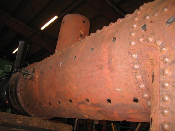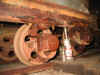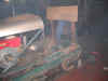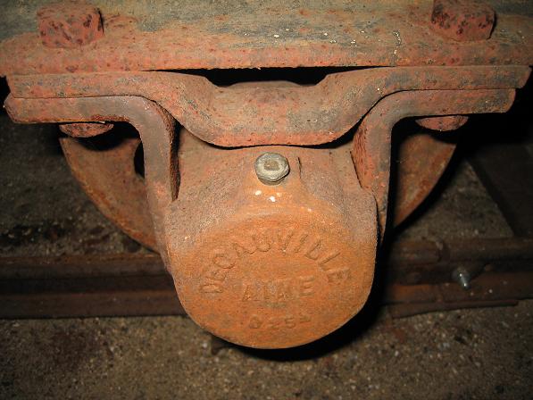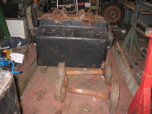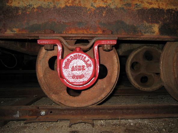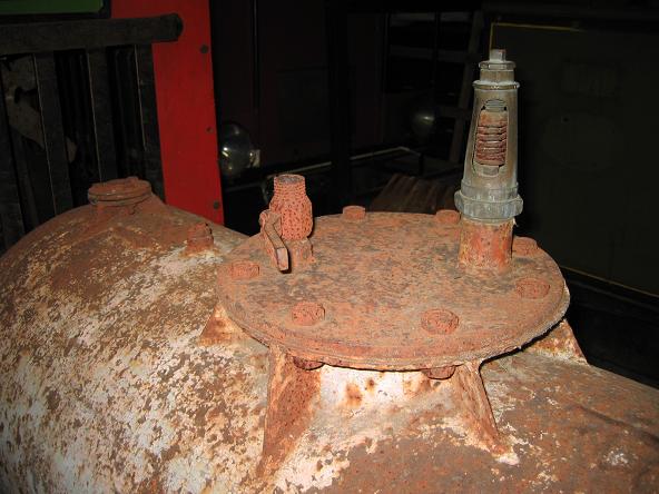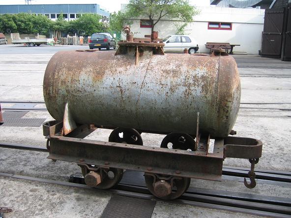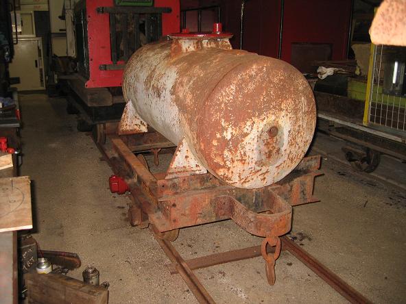 Pour ma part, je continue la remise en état de mon wagonnet citerne Decauville. Arrivé au CFC le 27 novembre 2002, ce wagonnet provient des anciennes Ardoisières de Trélazé. Si les boîtes d'essieux , de par leurs marquages, témoignent que le wagonnet est de construction Decauville, la citerne, quand à elle, semble avoir été ajoutée postérieurement. En effet celle-ci est maintenue par des équerres soudées, lesquelles sont vissées à des poutrelles ; ces dernières étant soudées au châssis. Plus aucune plaque de construction ni de repère ne subsistant sur la citerne, il m'est impossible de connaître le nom du constructeur, sa date de fabrication ni sa pression de service. Seule sa belle soupape m'indique qu'elle était bien sous pression. J'en saurais plus lorsque j'aurais ouvert le trou d'homme...