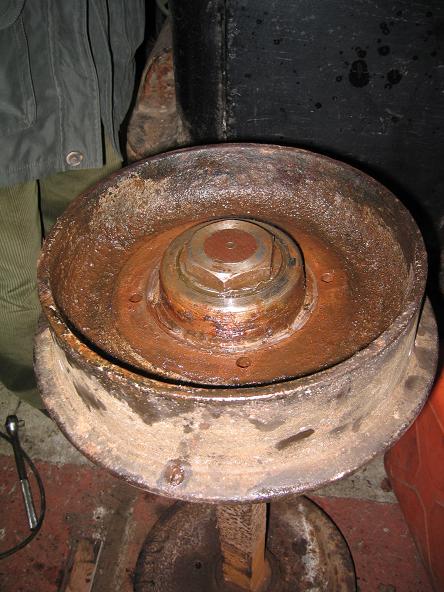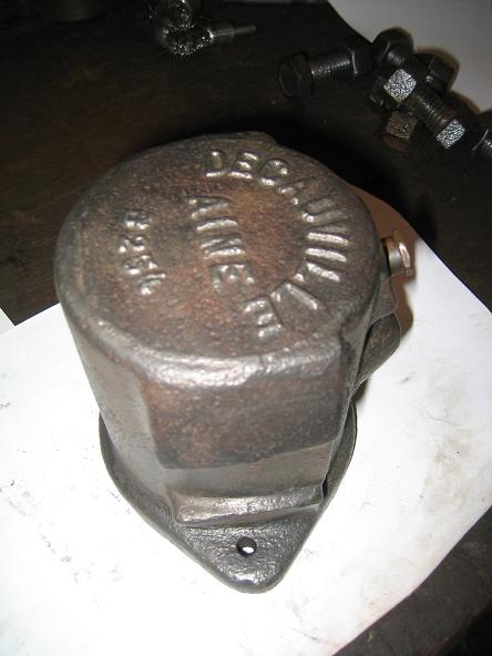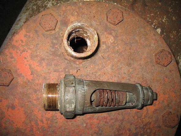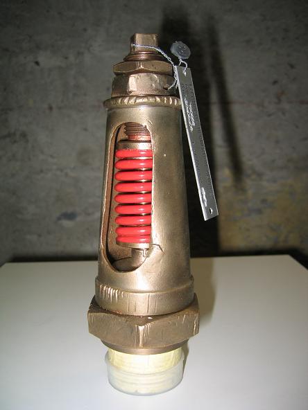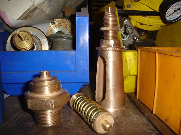Le 04/04/08, le premier travail de remise en état a consisté au démontage de cette soupape, dont le ressort, fortement corrodé, n'a pu servir que de modèle pour son remplacement. Transportée à Lyon, je l'ai confiée à mon beau père, spécialiste de ce type de matériel et qui m'a fait la surprise de me la remettre complètement restaurée et tarée (avec certificat de tarage SVP !) en Juin 2008 pour mon anniversaire.