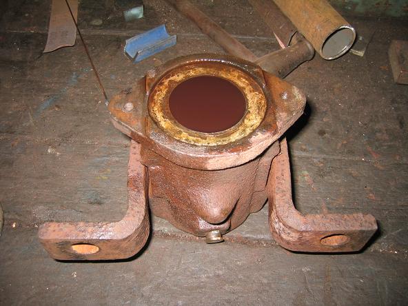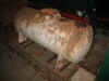 Par sécurité, je coupe le chauffage pendant la nuit, mais à ce moment là, la peinture est déjà quasi sèche ! Plutôt efficace ! Ça s'annonce plutôt bien. Le lendemain, pendant un dernier petit coup de séchage / réchauffage du bonhomme, après essai de montage du premier joint feutre sur la fusée d'essieu, je découpe les trois autres joints. Ensuite, je retourne auprès de la citerne et la purge de tout le sable mêlé de rouille qui en tapisse le fond. Je peux alors me livrer à un examen intérieur plus que satisfaisant. Je ne sais pas quel a été l'usage de cette citerne, mais il y a fort à parier que ce n'était que de l'air tant la corrosion est superficielle. Cela expliquerait du même coup la présence de la soupape.