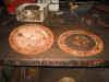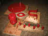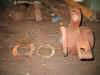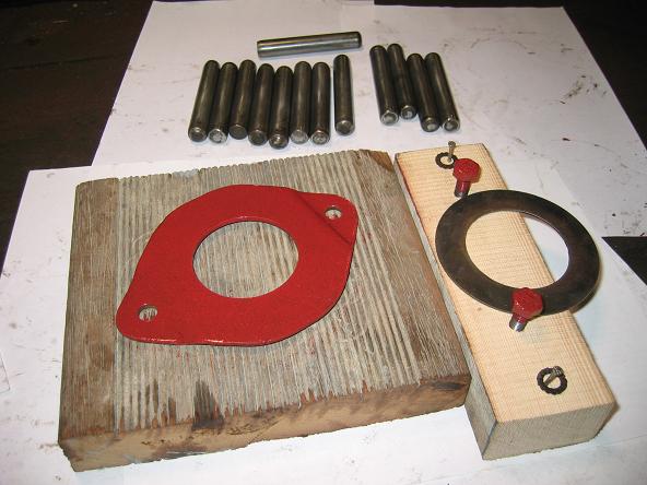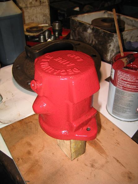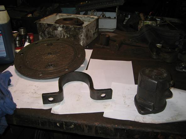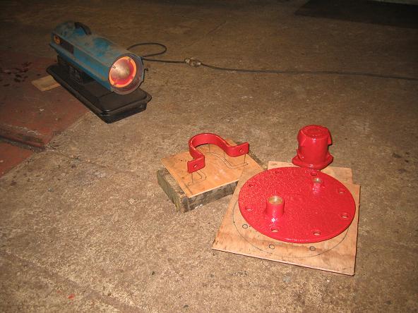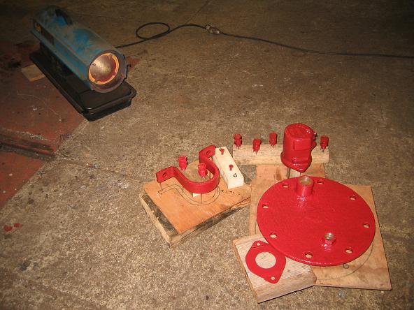 Ce n'est que le lendemain samedi, après l'AG que je m'attaque au décapage de l'ensemble de ces pièces. Ensuite, pour cette boîte d'essieu, je taille un joints neuf dans une chute de feutre tout juste suffisante pour en faire quatre. Il ne fait pas chaud dans l'atelier et si je suis bien couvert, la peinture, elle, risque fort de ne pas être sèche pour le remontage prévu le lendemain ; l'idée étant que la Citerne puisse être déplacée si besoin ; aussi j'utilise le chauffage soufflant tant pour moi que pour activer le séchage des pièces reposant sur des supports en bois munis de clous (ainsi pas de trace). Peu à peu, les pièces s'accumulent devant le chauffage, je continue le décapage des dernières petites pièces, sans oublier de tourner périodiquement celles qui sont au séchage accéléré. Pendant ce temps, je récupère et sèche les rouleaux.