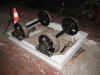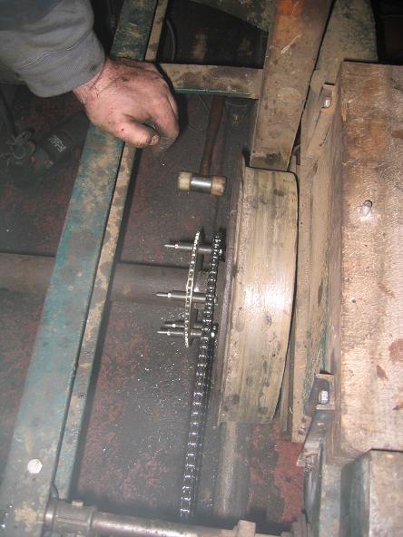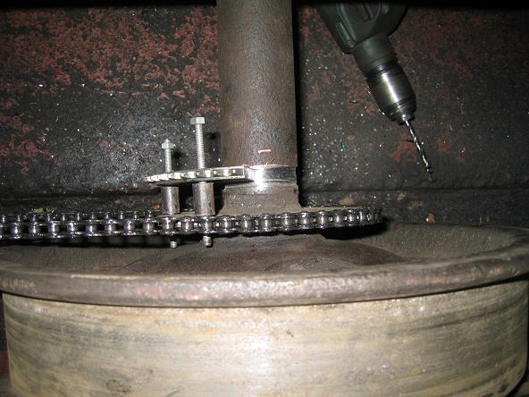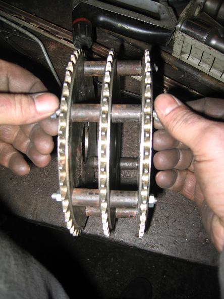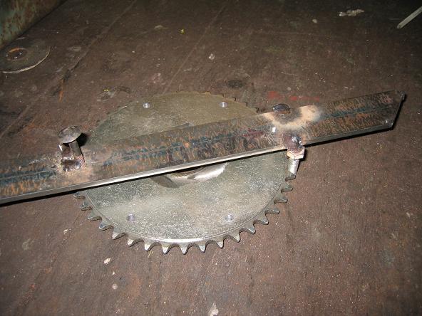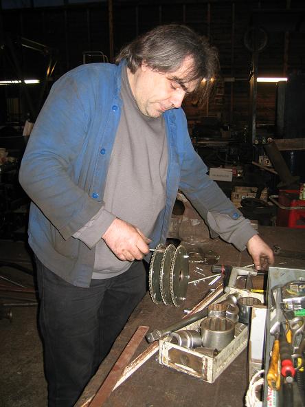 Du côté de la Mike-Gaver chinoise mobile, plus communément nommée aujourd'hui la ''Tromobile'', par notre ami Vincent, les travaux avancent bon train ! Certains d'entre vous ont pu découvrir cet engin aussi rockant que bolesque durant les Rencontres Internationales à Ramsen au mois d'octobre 2008 dans sa version juste roulante, mais le projet de notre amis ne saurait se contenter de cette première étape. Les rencontres furent un véritable banc d'essai où l'engin a plus que fait ses preuves et même dépassé les espérances de son concepteur-réalisateur, au plus grand plaisir de toute la délégation du CFC, entre autre. Après la mécanique, juste roulante, place aux perfectionnements et à la carrosserie. Pour cela, Vincent à sa ''petite'' idée et pleins d'astuces, car voyez-vous, avec lui point de crayon, plan, ou simplement croquis, tout n'est qu'assemblage d'éléments hétéroclites et de chutes divers savamment ajustés et assemblés, souvent par soudure, au gré de l'inspiration du moment, pour former ce qui promet d'être, comme son nom l'indique, la ''Trop Mobile'' du siècle ! Côté capot moteur, il a déjà soudé la charnière centrale et riveté la première tôle. Côté mécanique, afin de soulager les chaînes motrices avant et arrière, maintenant que tout fonctionne, Vincent s'occupe de les tripler. Pour cela, il fabrique des entretoises pour positionner ses roues dentées sur les essieux ; essieux qu'il ''rectifie à la disqueuse'', Tromobile calée sur deux cric hydrauliques et moteur en route ! Ensuite, il coupe en deux ces roues dentées et les soude sur l'essieu, mais tout vous décrire ici serait trop long, alors le plus simple est encore la preuve par images :