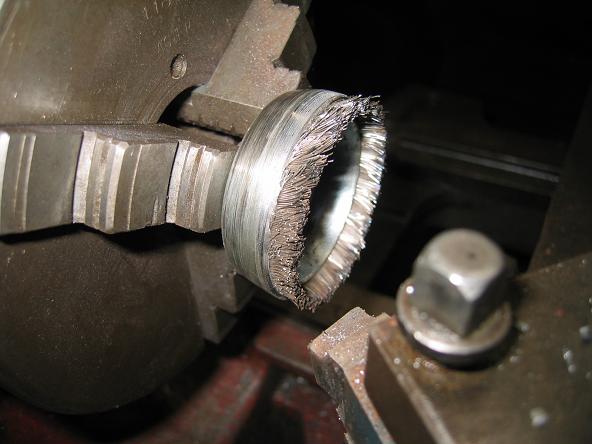 Avant de partir, une fois tous les outils rangés, et vu qu'il me reste encore un peu de temps, j'en profite pour raviver une vieille brosse rotative pour meuleuse. Usée jusqu'à la corde, et donc devenue inutilisable alors qu'il reste encore 5 bons millimètres avant d'arriver au niveau de la cloche intérieure, j'usine la cloche extérieure, rendant alors ces 5 mm utilisables pour la prochaine fois. Vous me direz ce n'est rien, mais au prix de ces brosses, sur 5 achetées, on arrive ainsi à en économiser une. Autre avantage : lorsque les poils sont courts, le brossage n'en est que plus efficace !