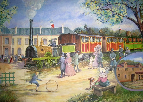 Le Paris—St Germain à la gare du Pecq. Fresque relatant le chemin de fer historique. |