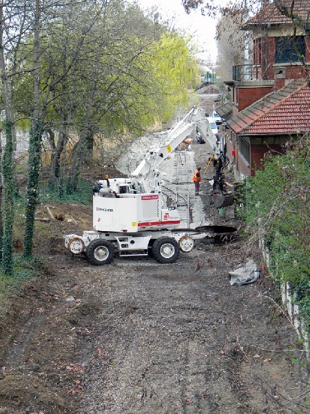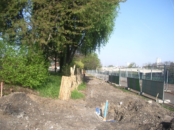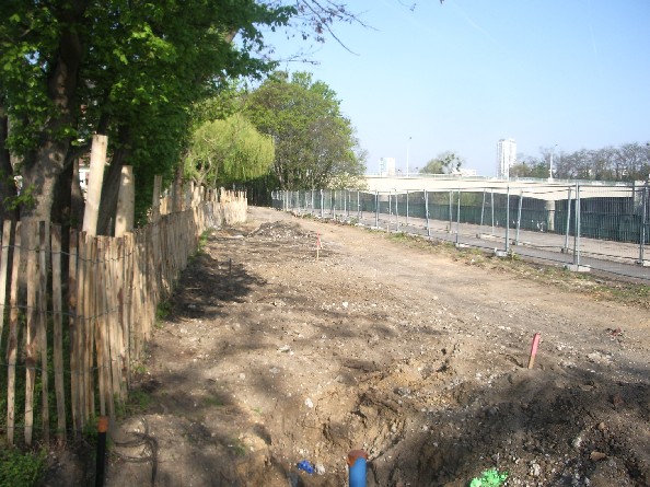 Derniers travaux au terminus des Mariniers le 29 mars 2010 (pose de la plaque tournante). Vue prise depuis le Pont d’Épinay. Photo Guy Defrance. |