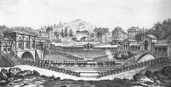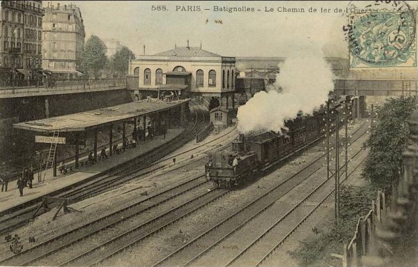 Après avoir traversé la tranchée des Batignolles, le train arrive à la gare des Batignolles qui sera rebaptisée Pont Cardinet.