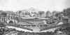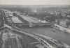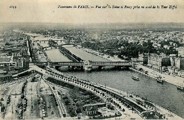 Vue de la Tour Eiffel. Noter l'importance des installations. On voit la ligne St Lazare—Champ de Mars par Auteuil et la petite ceinture qui se détache vers le nord par un pont en courbe sur la Seine, là où Robert Fulton a fait ses essais de bateau à vapeur. |