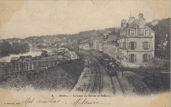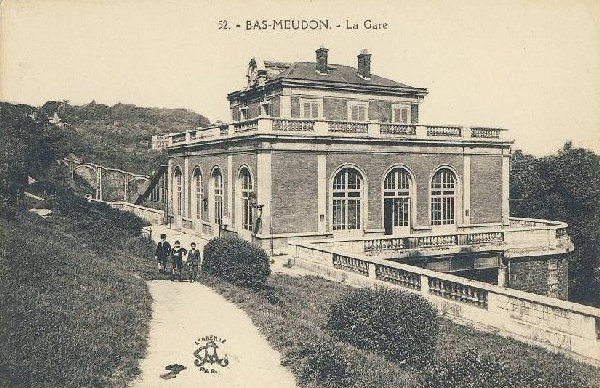 Comme beaucoup de gares de la ligne, la gare du Bas Meudon (aujourd'hui Meudon-sur-Seine) est construite à cheval sur les voies et au niveau du coteau. |