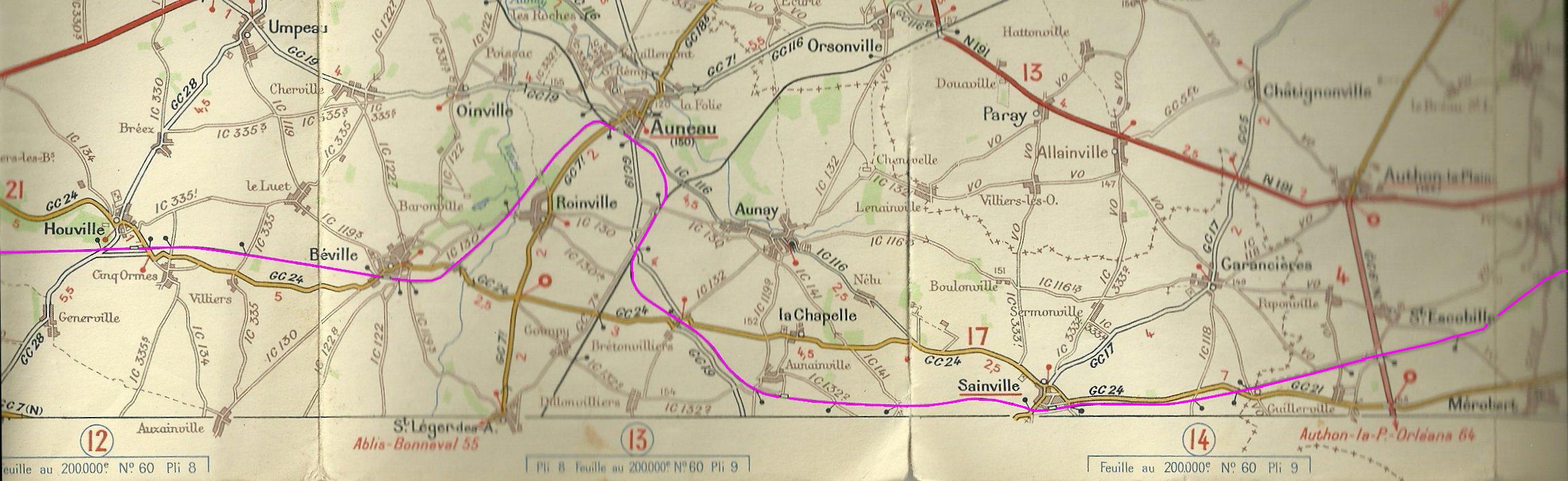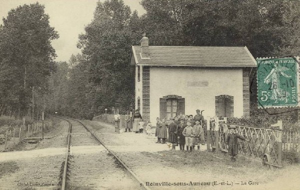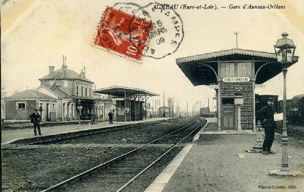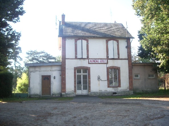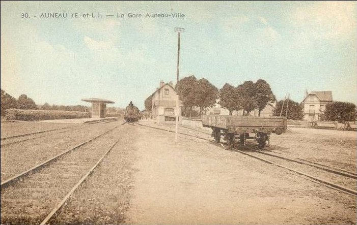 | Aunay-sous-Auneau Bien que pas directement sur la ligne l'embranchement militaire d'Aunay-sous-Auneau mérite d'être évoqué. Il a été créé lors la guerre de 1914-1918 pour disposer, non loin de Paris, et à proximité d'une gare, d'un vaste terrain pour servir d'entrepôt de matériel et de centre d'entraînement militaire. Une surface de 33 hectares, longe la ligne de chemin de fer, face à la gare d'Auneau-Embranchement, du passage à niveau de Roinville jusqu'à la route d'Auneau. Du côté gare, un embranchement particulier fut créé ainsi qu'un réseau de voies ferrées sillonnant les 30 hectares du Camp. En bordure de ces lignes, des hangars ont été montés pour abriter le matériel, à l'époque presque exclusivement de terrassement du Génie. En 1940, la Wehrmacht occupe le site. Les allemands améliorent encore les installations. En 1944, l'armée américaine investit la place abandonnée par la déroute allemande. |
