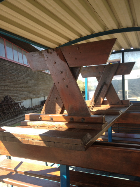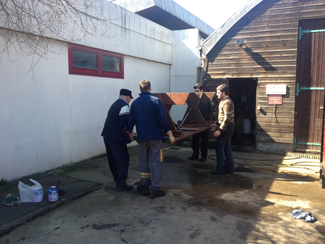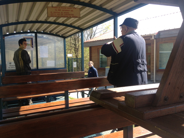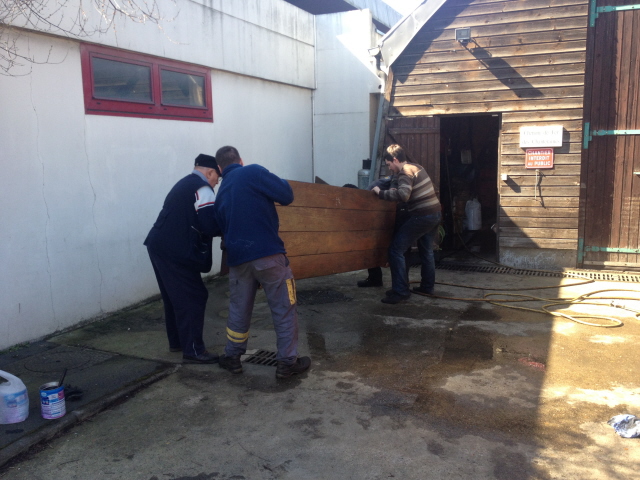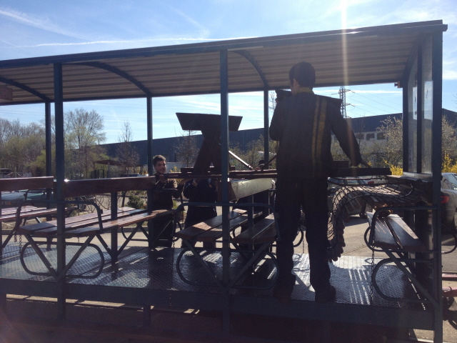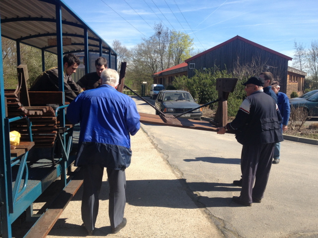 Mais l’heure passe et il faut penser à mettre en place la table et les bancs d’été pour pouvoir manger dehors à midi car il fait un temps vraiment printanier. On profite de la manœuvre des baladeuses pour approcher la table qui était hivernée dans le dépôt 2.