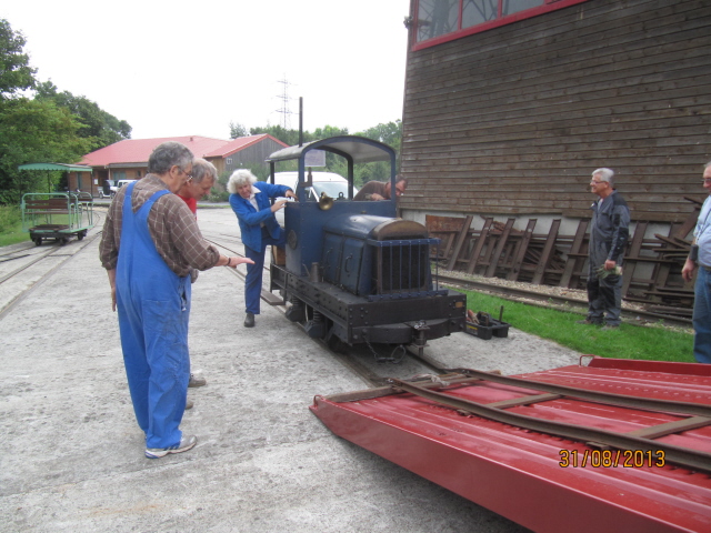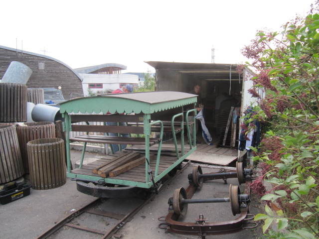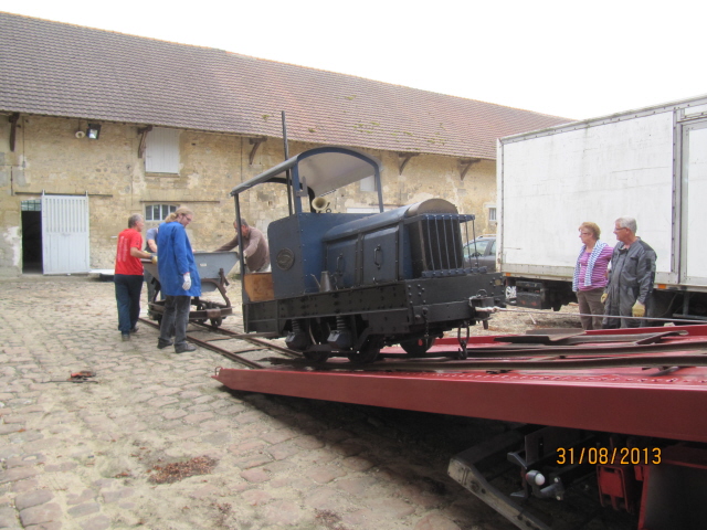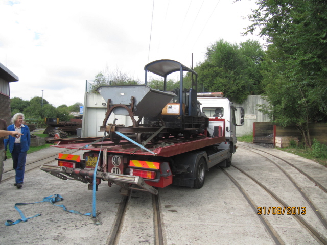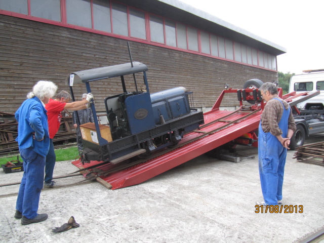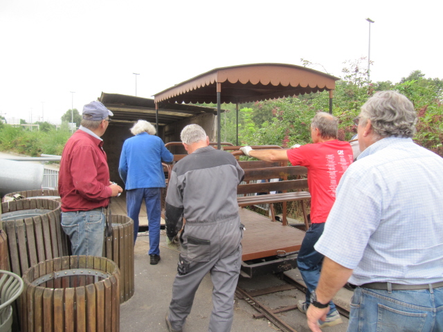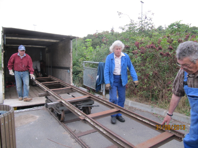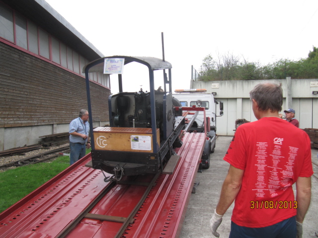 Après le chargement dans le camion fermé des coupons de rails, ce fût le tour à 2 des 3 baladeuses d’être amenées par le rail sur le quai de chargement .dans le camion fermé.