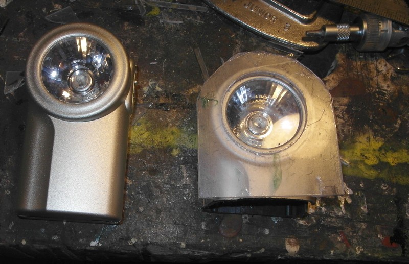 Ainsi pour confectionner les projecteurs, j’ai utilisé des lampes de poches dont la forme et le réflecteur convenaient, après certes une adaptation !