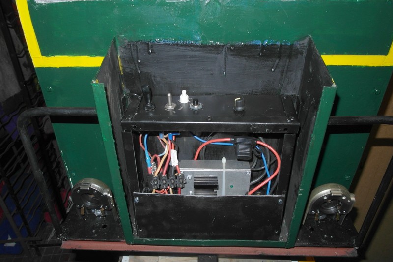 e) le pupitre en cours de réalisation : on aperçoit le régulateur qui peut absorber près de 40A au démarrage ! le fusible du circuit de traction ainsi que les relais y sont placés.