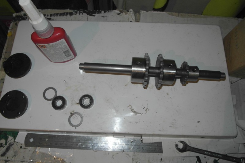Les roues usinées sont montées sur les axes sur un emmanchement cylindrique, afin d’assurer le collage j’ai utilisé de la Loctite (colle 601 ou 638) dite « blocpresse ». Cette colle anaérobie assure idéalement le collage des métaux dans des environnements à faible température d’utilisation (50°C) et non agressifs (à noter qu’il est possible de l’utiliser sur l’alu, mais le montage est moins pérenne…). Evidemment, avant le montage sont placés les pignons qui sont immobilisés par des goupilles….