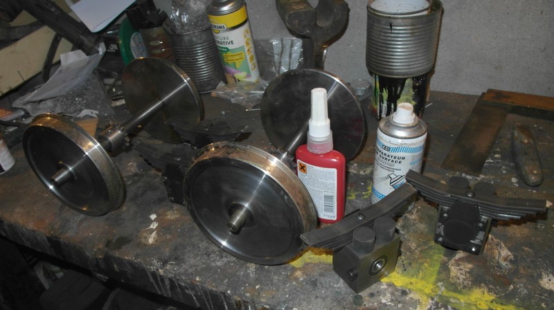 Les « boîtes » d’essieu, sont constituées , d’un simple cube de métal usiné, percé et taraudé dans lequel un roulement à bille est placé, et pour la suspension sont confectionnés des ressorts à lame complétant les silent-blocs ainsi dissimulés.